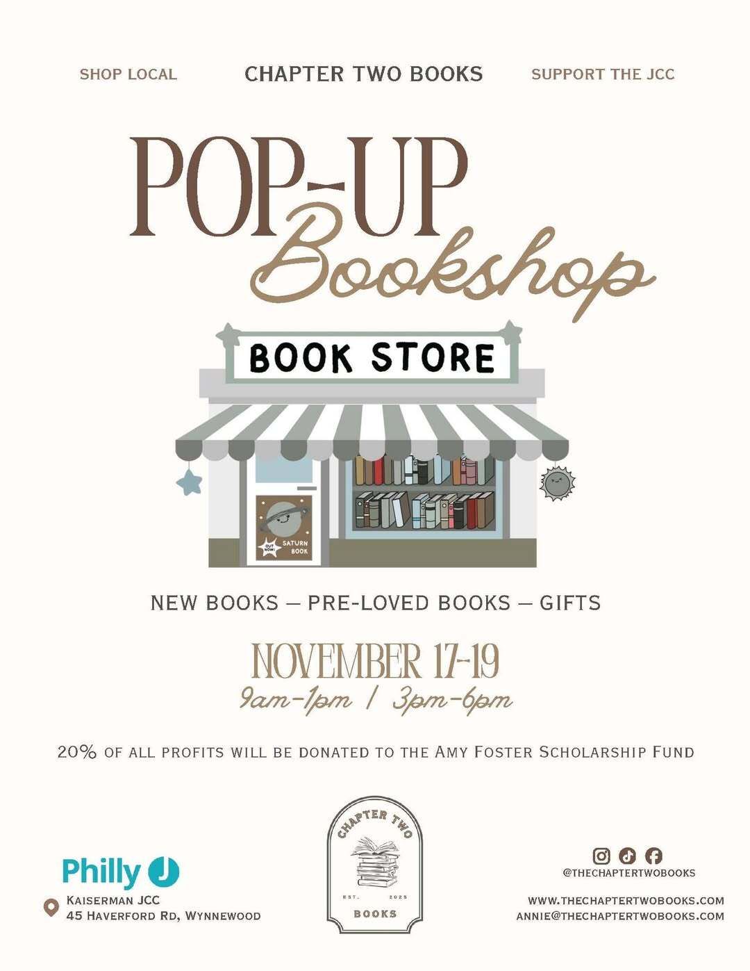 ![]() JCC FB Page | Chapter Two Books Pop-Up Bookshop at the Kaiserman JCC Discover new reads, pre-loved treasures, and thoughtful gifts for all ages at this special Chapter Two Books pop-up event! ✨ Giving Back: 20% of all profits benefit the Amy Foster Scholarship Fund, helping make JCC programs accessible to more families. A perfect way to shop local and support your community this season! |