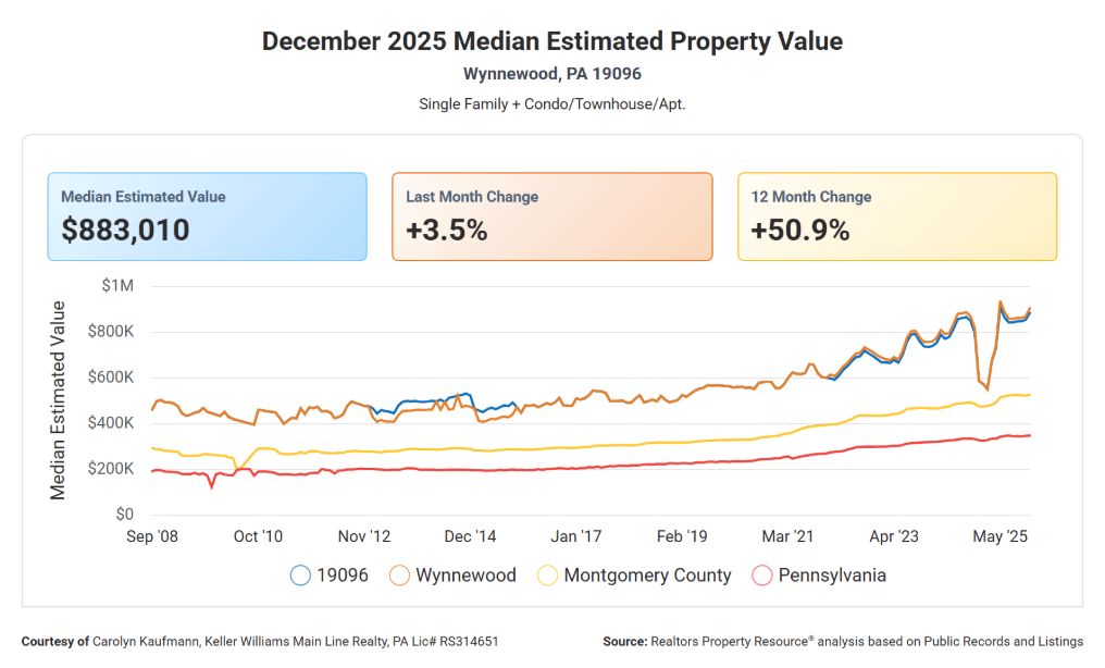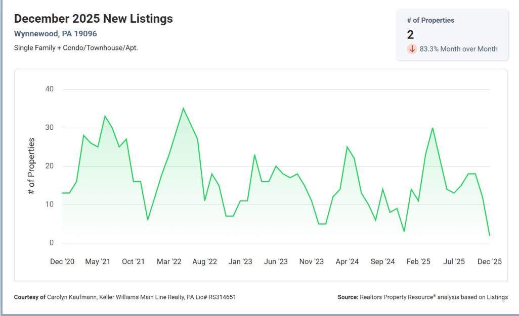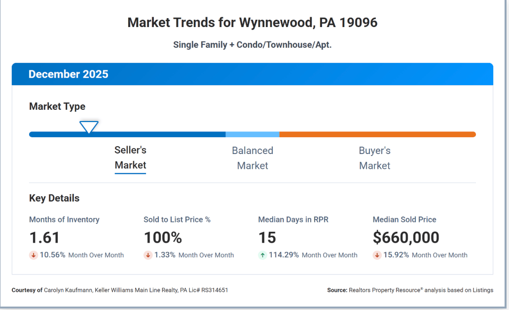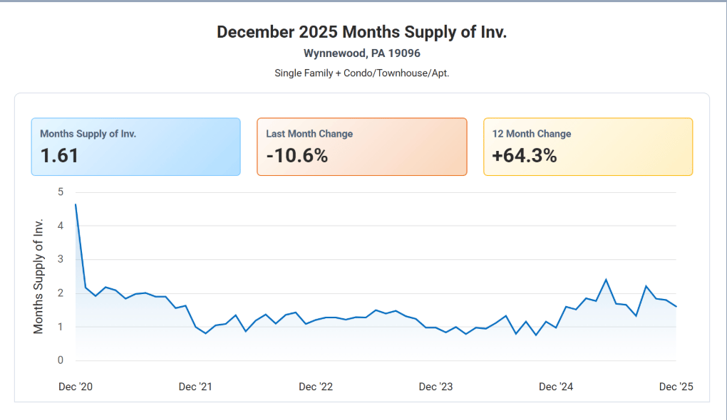 Inventory remains tight in Wynnewood, with just 1.61 months of supply, keeping the market competitive as we head into 2026. The median sold price was $660,000, and homes continued to sell right at asking, with a 99.95% sold-to-list price ratio.