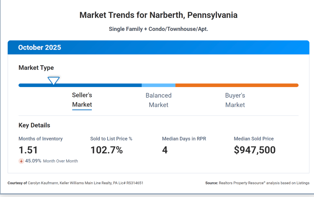 ![]() October Market Summary- NARBERTH | ![]() Narberth Housing MarketThe market remains hot and fast-moving, with homes selling quickly and often above asking price. Inventory is extremely tight at 1.51 months, down 45% from last month, creating a strong seller’s market. New Listings: 5 homes, median price $500,000 Active Listings: 7 homes, median price $1,299,000 Pending Listings: 6 homes, median price $482,500, spending just 16 days on the market Sold Listings: Median price $947,500, selling at 102.68% of asking Sales Pace: Homes are typically selling in just 4 days Takeaway: Buyers need to move quickly, and sellers can take advantage of high demand and fast sales. Coordinating your buying and selling strategy is key in this dynamic market. Let’s Talk! |