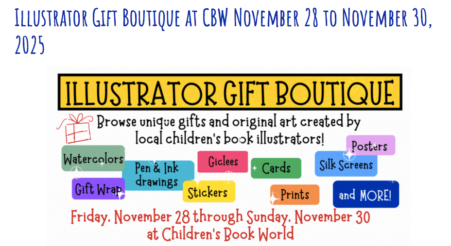 ![]() Children’s Book World | 🎁 Gift Boutique! Kick off the season with unique gifts from the illustrators behind your favorite books! Find original artwork, prints, cards, ornaments, and more—perfect for holiday giving. Fri, Nov 28: 10 AM–6 PM Sat, Nov 29: 10 AM–5 PM Sun, Nov 30: 12–4 PM Support local artists and discover one-of-a-kind treasures! |