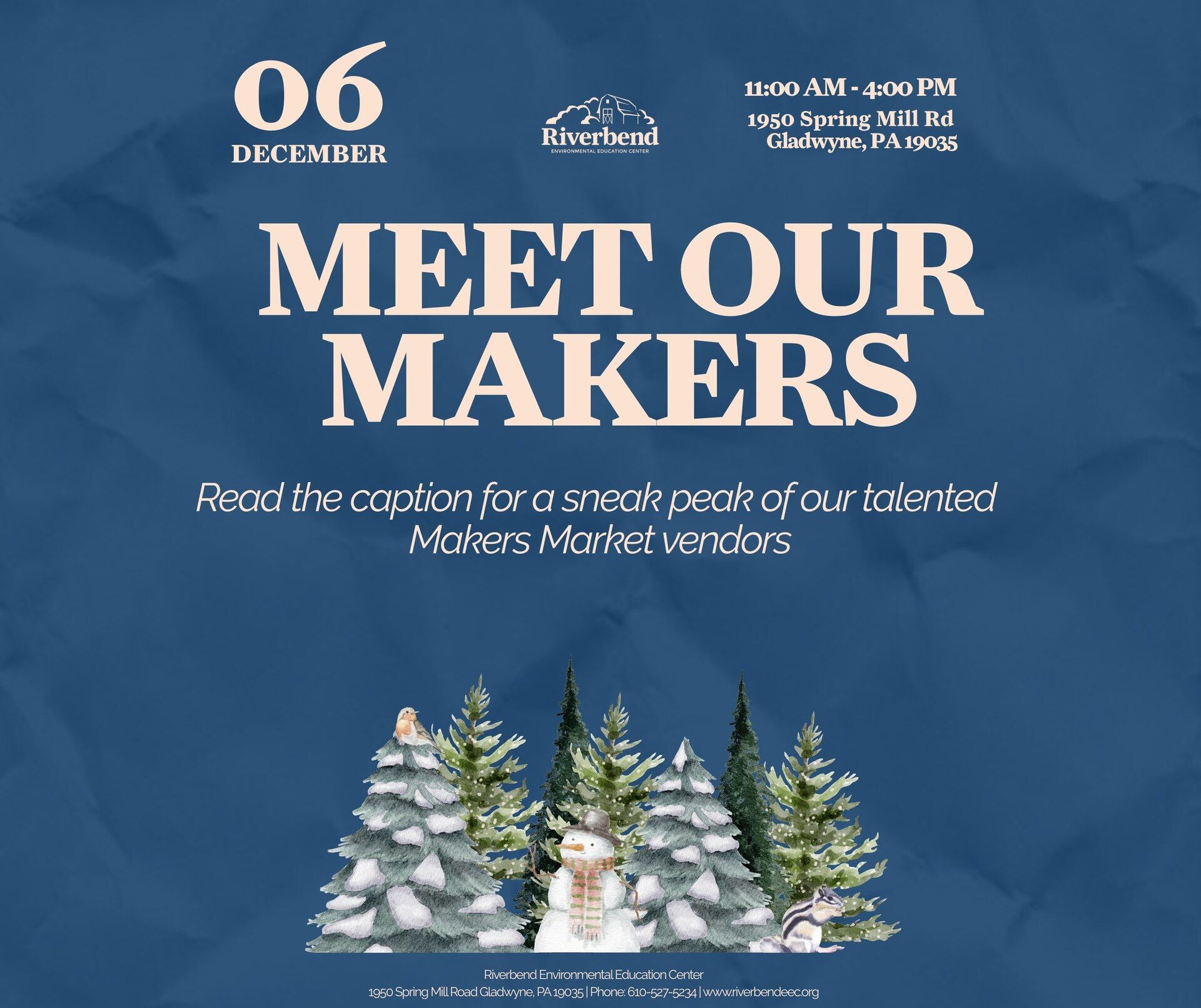 ![]() RiverBend Environmental Center | Riverbend’s Makers Market on Sat, Dec 6th from 11AM-4PM Enjoy warm tea or coffee, toast marshmallows by the fire, and browse unique, locally made gifts. Featuring local makers: Anna Bees Honey – Raw honey & beeswax goods, Jennifer Burman – Mala necklaces, art, terrariums & upcycled fashion Brewtay Coffee – Small-batch coffee & loose-leaf tea Care Package Bakes – Seasonal treats, cookie tins & gluten-free/vegan options Cool as a Cuc – Fresh, homemade soups Multiflora Skincare – Natural, handmade skincare Josh Landow – Wheel-thrown pottery Redmond Made – Ceramics & reclaimed-material art Mad Hatter Emporium – Delco, Phillies, and Eagles-inspired gifts |