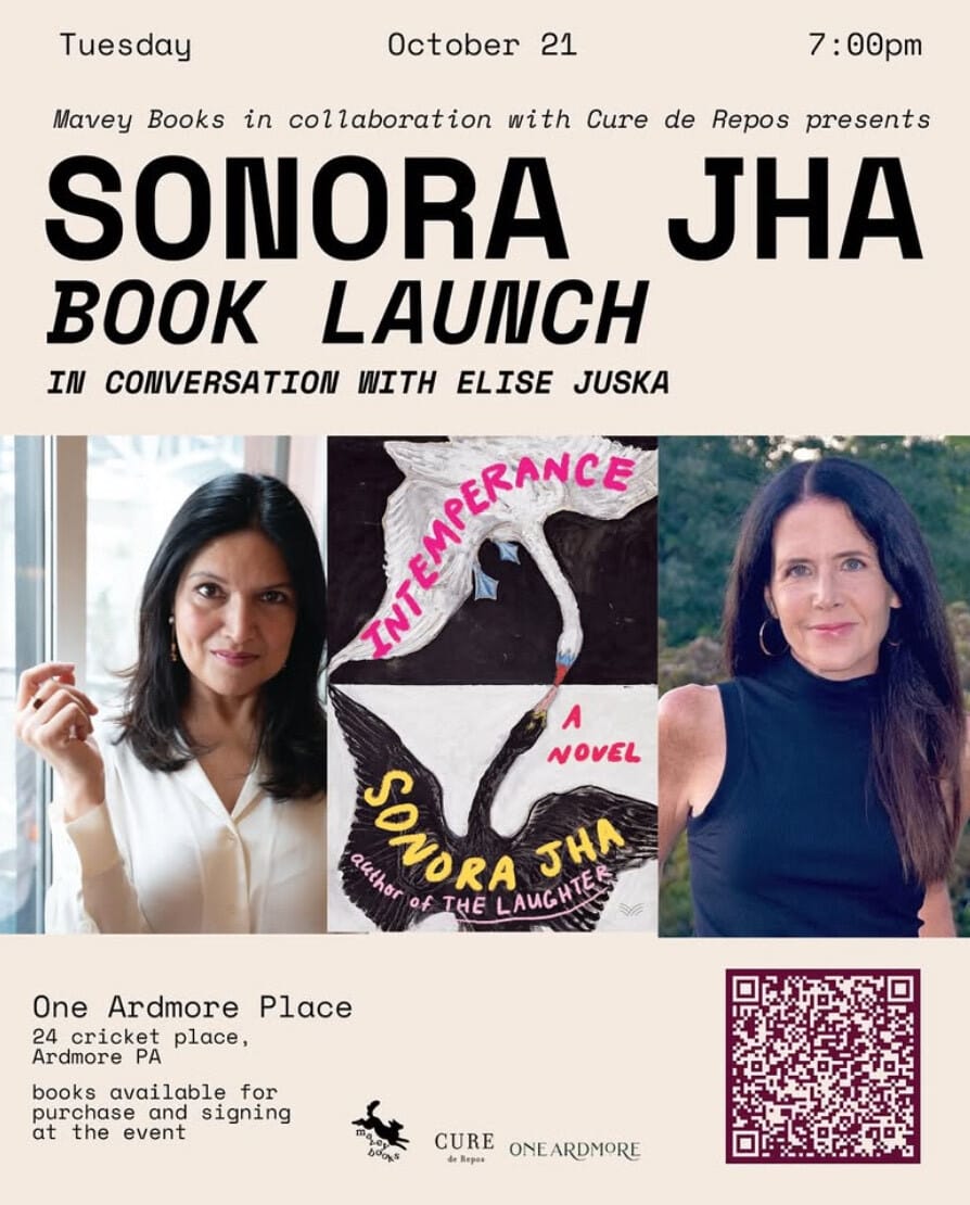 Join Mavey Books on Tues, Oct 21st at 7:00 PM for an evening with acclaimed author Sonora Jha, in conversation with Elise Juska, at One Ardmore Place (24 Cricket Ave, Ardmore).