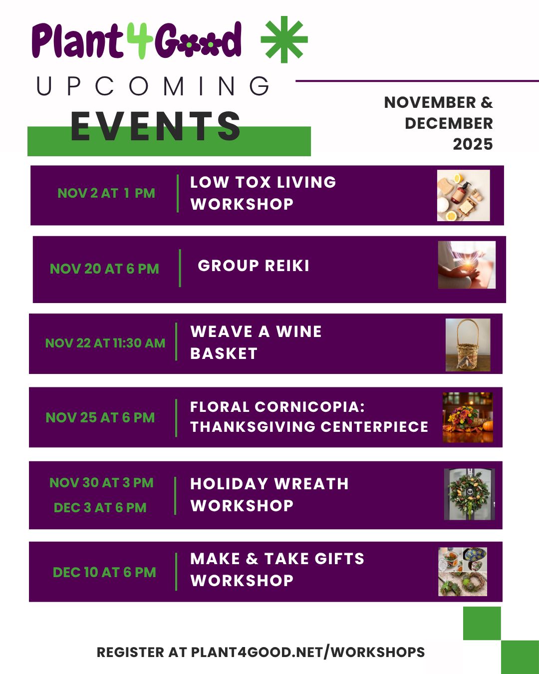 ![]() Plant 4 Good | 🌿 Plant4Good Workshops: November & December 2025Low Tox Living Sat, Nov 2 at 1 PM Group Reiki Thurs, Nov 20 at 6 PM Weave a Wine Basket Sat,Nov 22 at 11:30 AM Floral Cornucopia: Thanksgiving Centerpiece Tues, Nov 25 at 6 PM Holiday Wreath Workshop –Sat, Nov 30 at 3 PM or Wed, Dec 3 at 6 PM Make & Take Gifts Workshop Wed, Dec 10 at 6 PM |