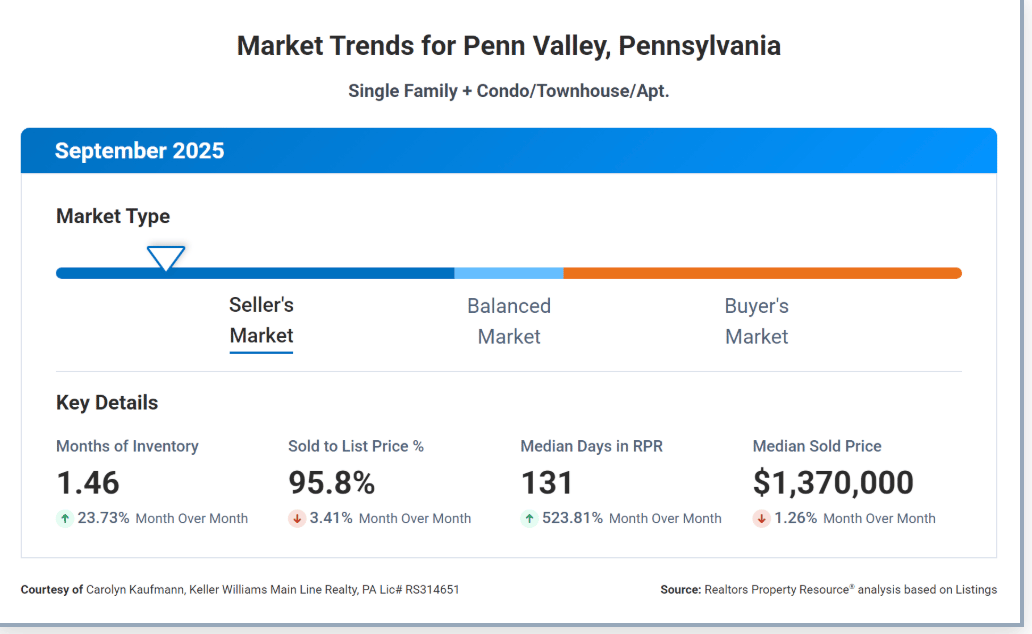 ![]() September Market Summary- PENN VALLEY | 📈 Penn Valley market continues to show strong demand and limited supply.Inventory: 1.46 months of supply; up 24% from last month, but still 32% lower than last year. New Listings: 4 new homes in September, with a median list price of $1,037,500. Active Listings: 6 homes currently on the market, median $1.1M. Pending Sales: 3 homes went under contract quickly — averaging 9 days on market — with a median list price of $1.495M. Closed Sales: Median sold price $1.37M, down slightly (1%) month-over-month, with homes selling at 95.8% of list price. Let’s chat! Coffee on me!☕️ |