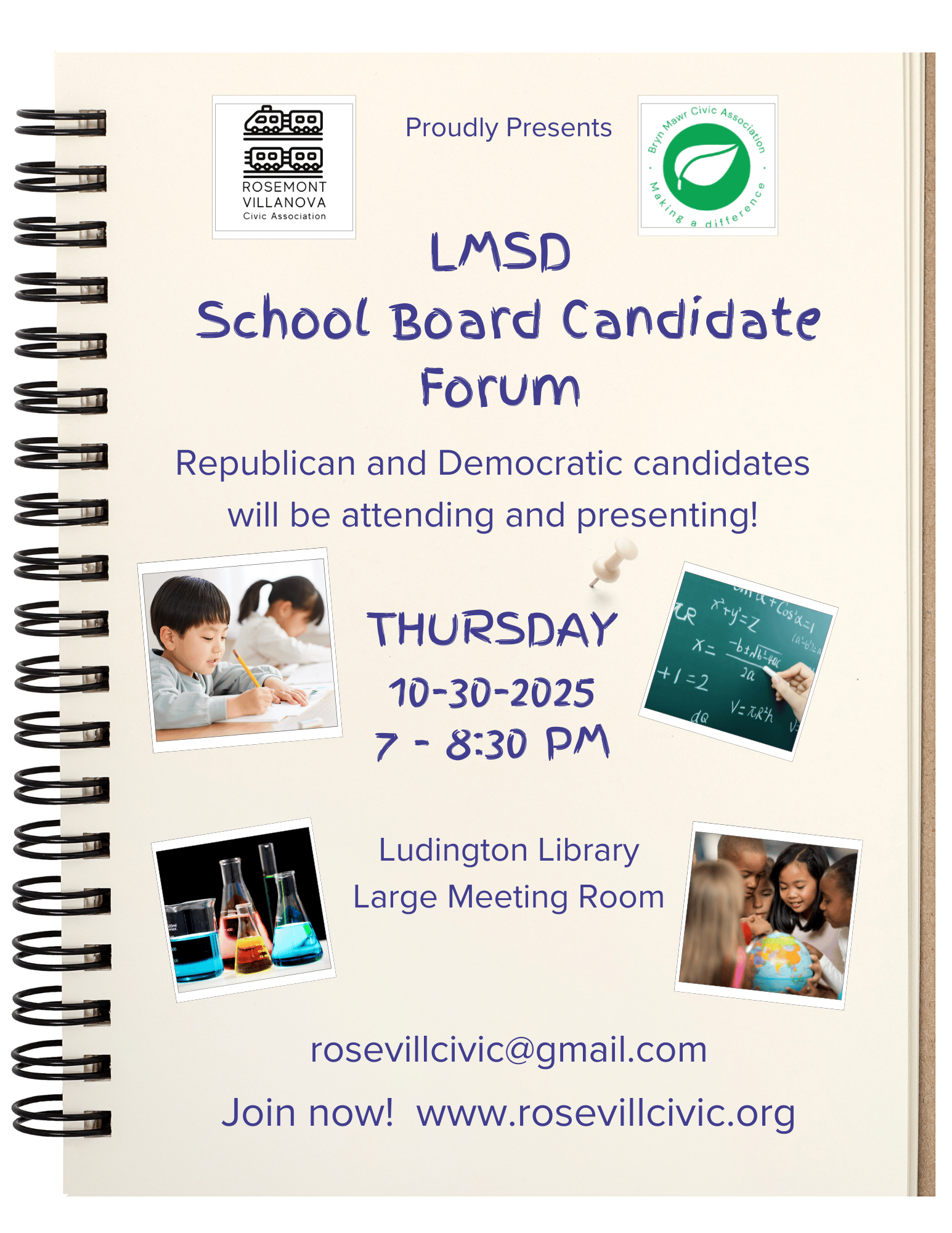 ![]() Villanova and Bryn Mawr Civic Association | LMSD School Board Candidate Forum Thurs, Oct 30th 7-8:30PM Ludington Library Come out and listen to your candidates! |