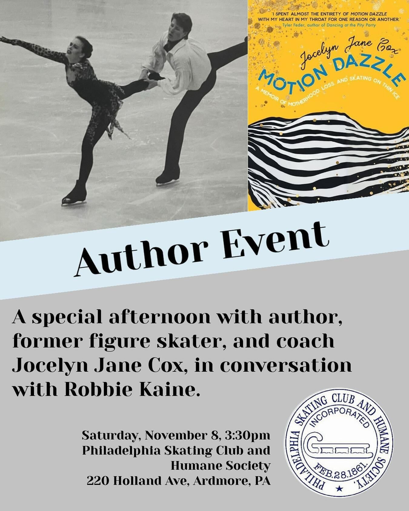 ![]() Philadelphia Skating Club FB Page | ⛸ Author Event: Jocelyn Jane Cox at the Philadelphia Skating ClubJoin former figure skater and author Jocelyn Jane Cox as she shares her new memoir about motherhood, loss, and skating. 🗓 Sat, Nov 8 at 3:30 PM |